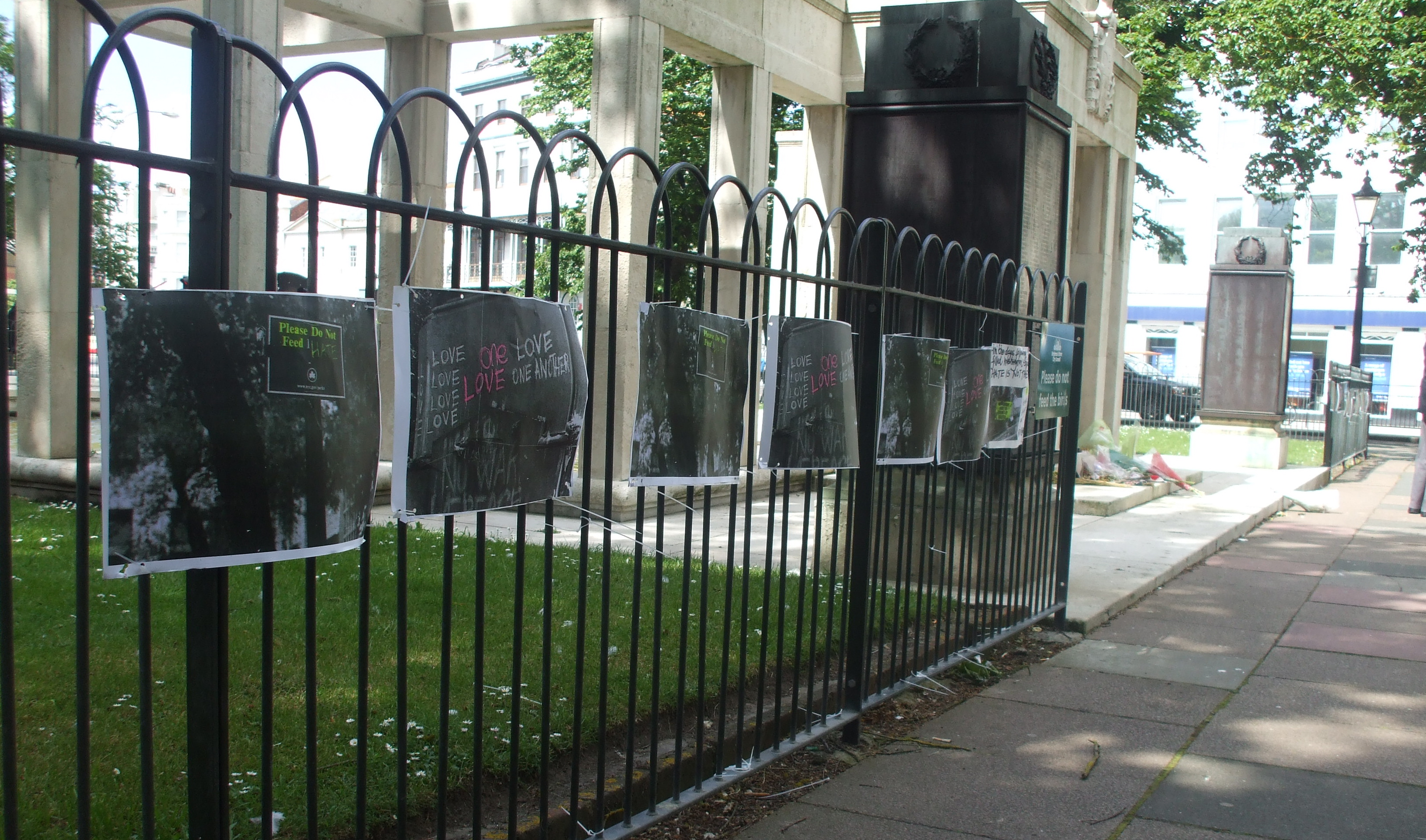 Meanwhile, an installation of anti-war photographs at Brighton’s Old Steine Memorial War was ripped down by community police officers. Entitled “Hate is not the answer”, the photographs displayed anti-war messages created New Yorkers in the days following 9/11. Maybe the cops think hate is OK. It keeps them in business.