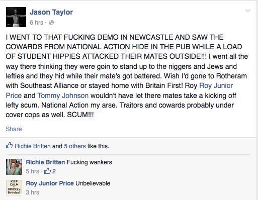 First off, SS wannabes National Action staged a “White Man March” in Newcastle. North East Antifascists, alongside London Antifascists and many other autonomous groups, confronted them and made sure they had a real shit time. Chants such as “Hitler was right!”, plus burning an LGBT and Israeli flag, got 9 of them (ie half of their demo) nicked for racial hatred. It ended with around 20 idiots standing protected by dozens of police, sieg heiling to an empty street. Well done guys, that was a major victory for the white race /sarcasm.