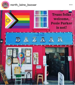 As ‘Nazi Barbie’ vanished into the sunset, her beleaguered supporters had to trudge on foot through Brighton’s busy streets pursued by an impromptu Pride parade chanting “train station’s that way!” This march of shame through the town centre resulted in a surreal coda to the days’ events, as a group of Posie supporters being escorted out of town by the heckling crowd chose to duck into the North Laine Bazaar on Upper Gardener St, which they then refused to leave. A stalemate ensued as the crowd sat down in the road outside chanting “Fuck off – Go home”. The owner of the flea market came out to tell us she was on our side and had asked the police to remove them but they were refusing to leave the shop. Someone in our crowd presented the shop owner with a bunch of flowers and she came and joined our demo to a huge round of applause! In the end three vanloads of cops had to arrive in order to load 5 or 6 Posie fans into the back and drive them off.