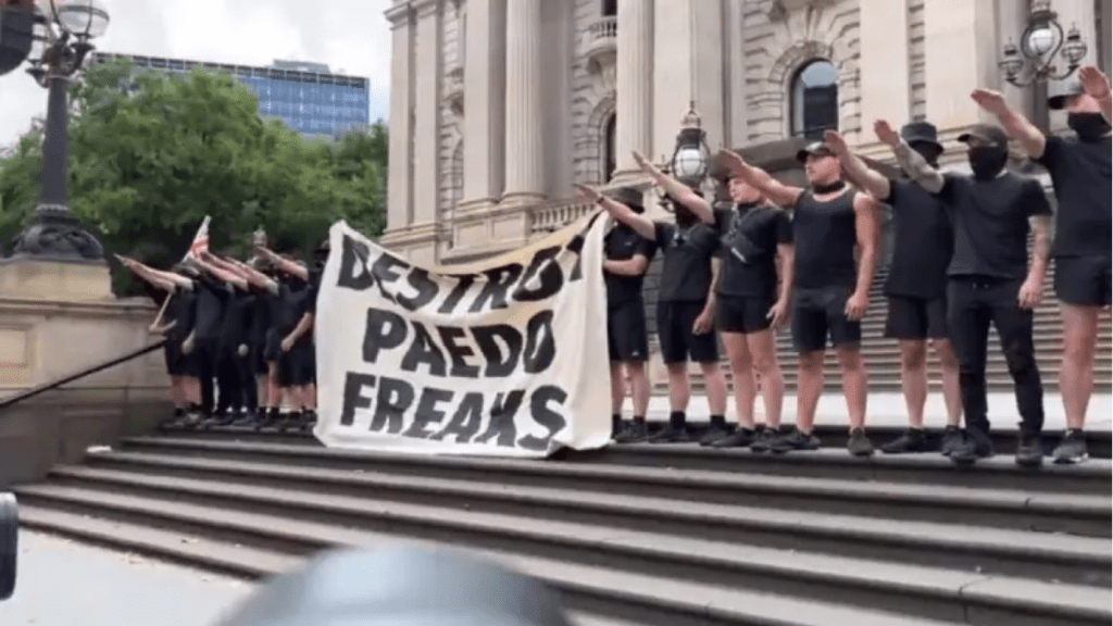 Keen has long attracted support from the far-right, and has herself praised Tommy Robinson. In her ongoing efforts to ingratiate herself with racists she has expressed support for Zionism, denigrated Palestinians and posted anti-Muslim hate. Supporting Zionism hasn’t stopped her also managing to get pally with anti-semites and neo-Nazis however. She has been hosted by white nationalist livestreamers, a speaker at one of her rallies quoted Mein Kampf favourably and in Australia she even attracted an ‘honour guard’ of sieg-heiling neo-Nazis with a banner saying “Destroy Paedo Freaks”. Nice people.